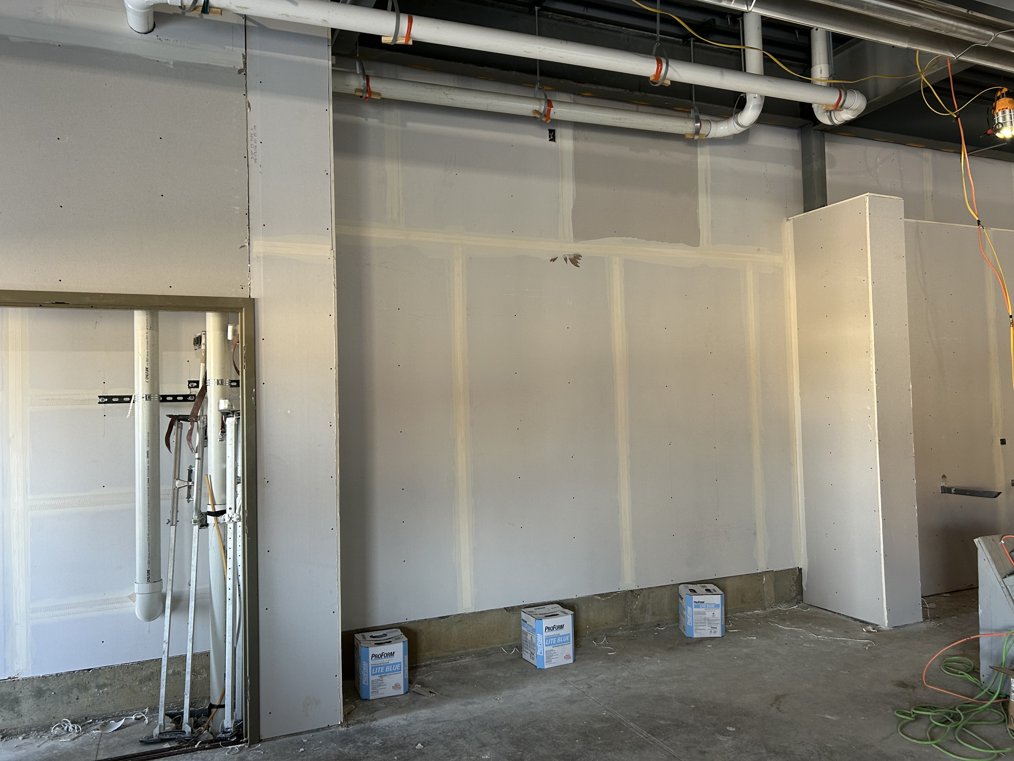 Taping and mudding was completed on the new drywall of the ambulance garage. Pictured here is where we'll later see cabinetry and a work station for our EMS staff.