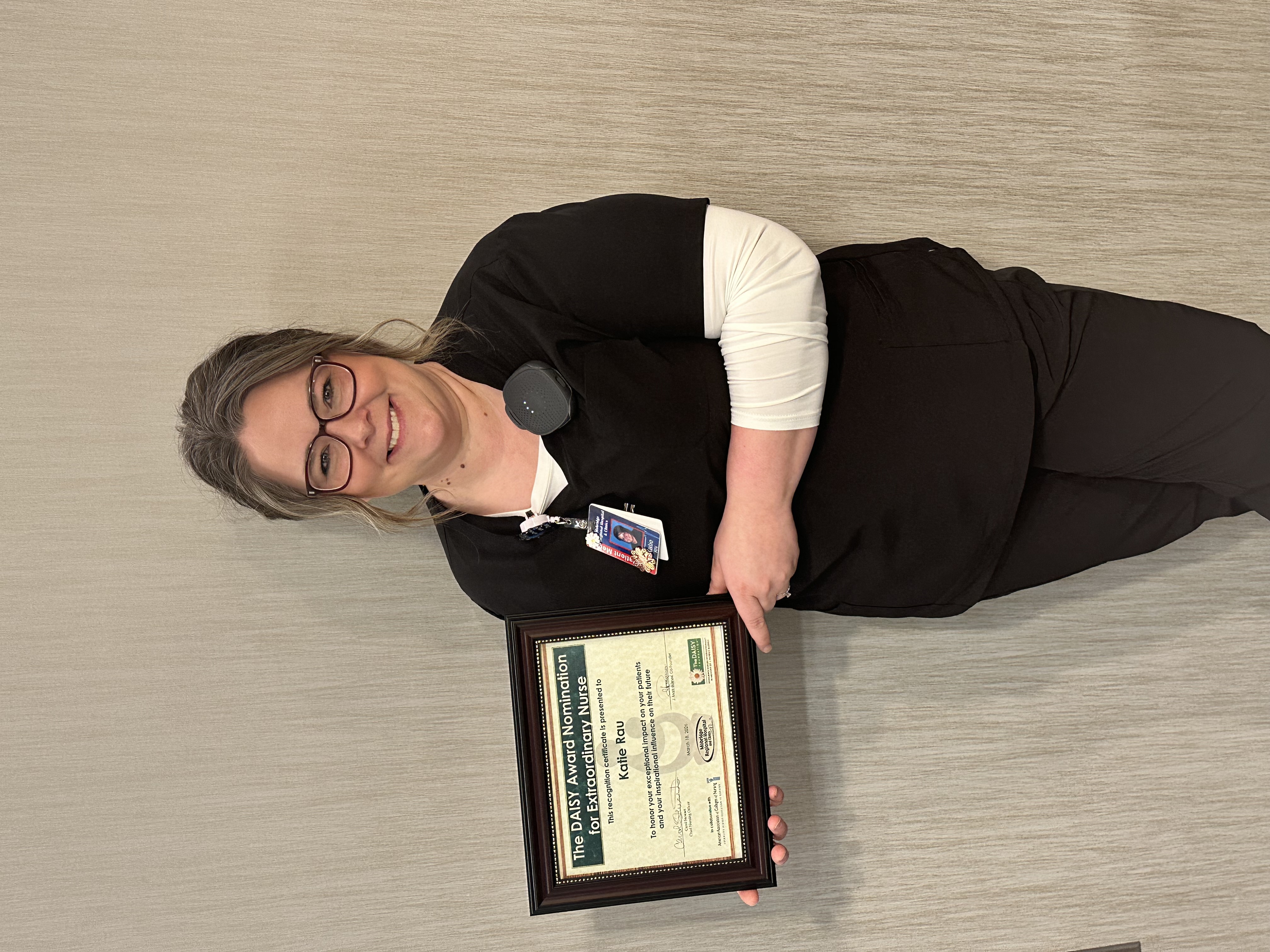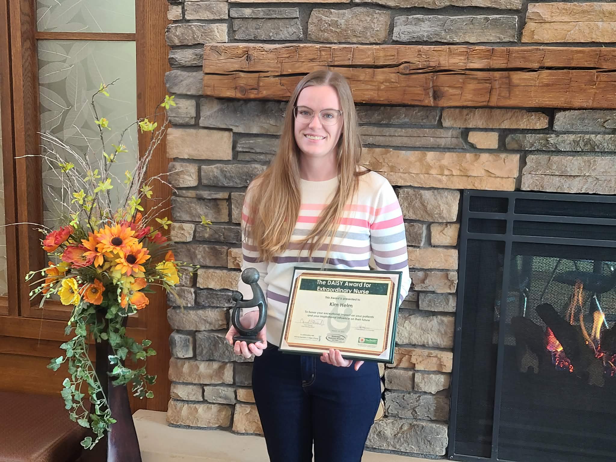 Pictured above: Kim Helm with her Daisy award certificate and Healer's Touch sculpture.