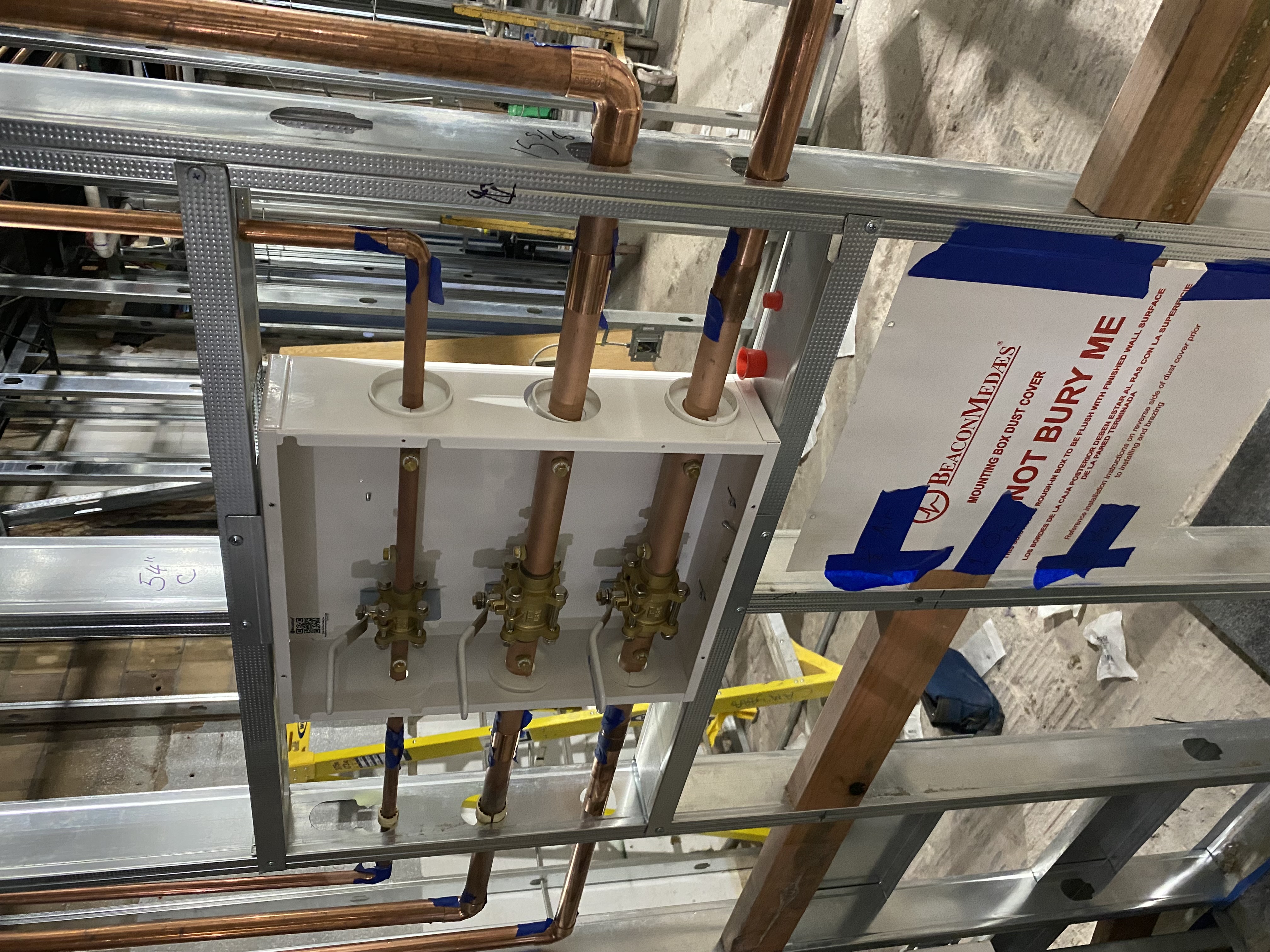 Shower valves were installed in our patient room bathrooms. Here you can see some prefab units that were brought in for installation. Additionally, several other plumbing projects were completed in June including hot and cold line installation and sanitary lines along with vents.