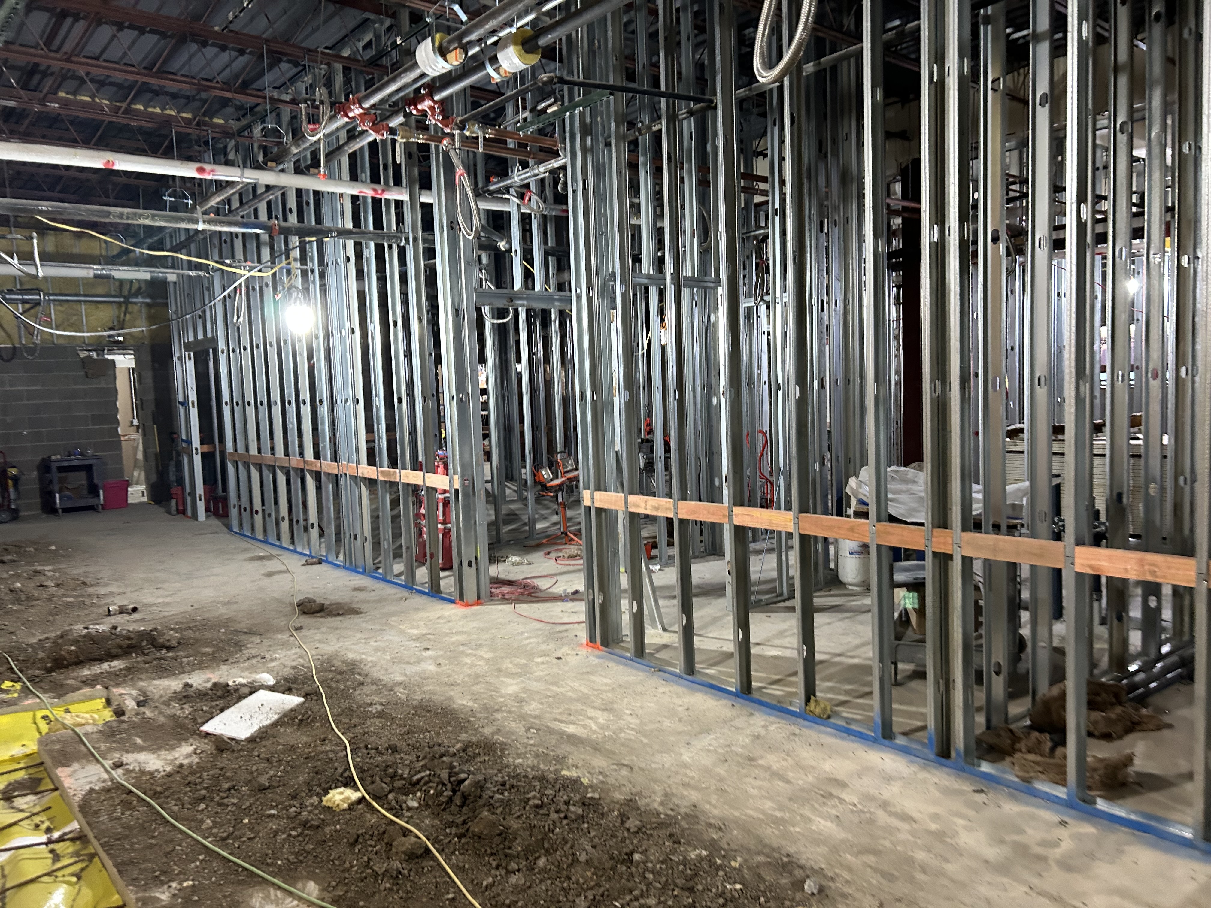 Framing of patient rooms began for interior walls and doorways. Pictured here, you can see the framing of the South patient rooms.