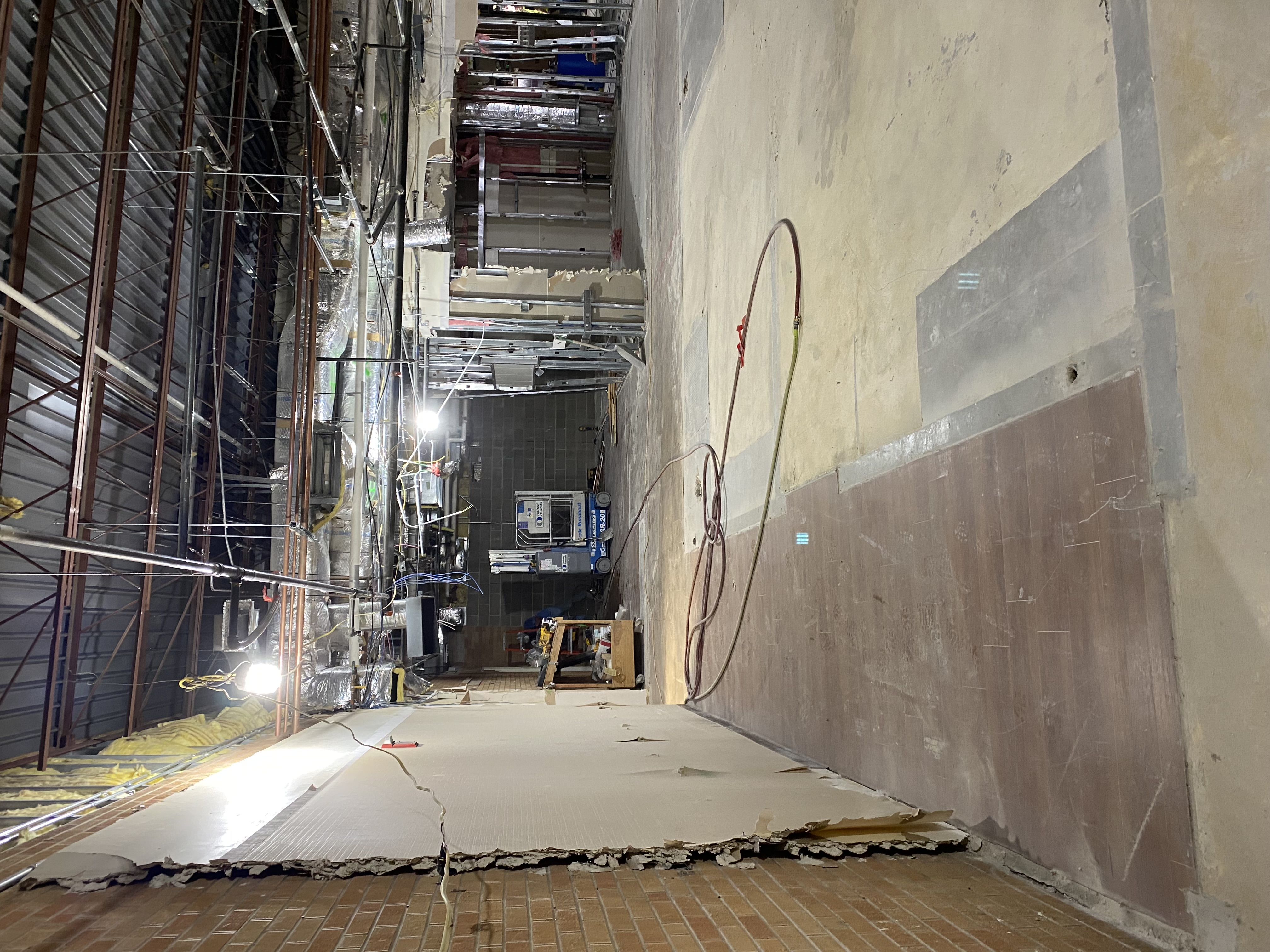 Joining the electrical from our current building to our new wing requires an intricate hive of wiring including this electrical vault. This runs cable wire from the existing circuits to the new switchgear. Some wiring is run in the ceiling while other wiring is run through conduit in tubes encased in cement as we’ve been building. The fishtape you see here are meant to help pull the wires through the conduit.