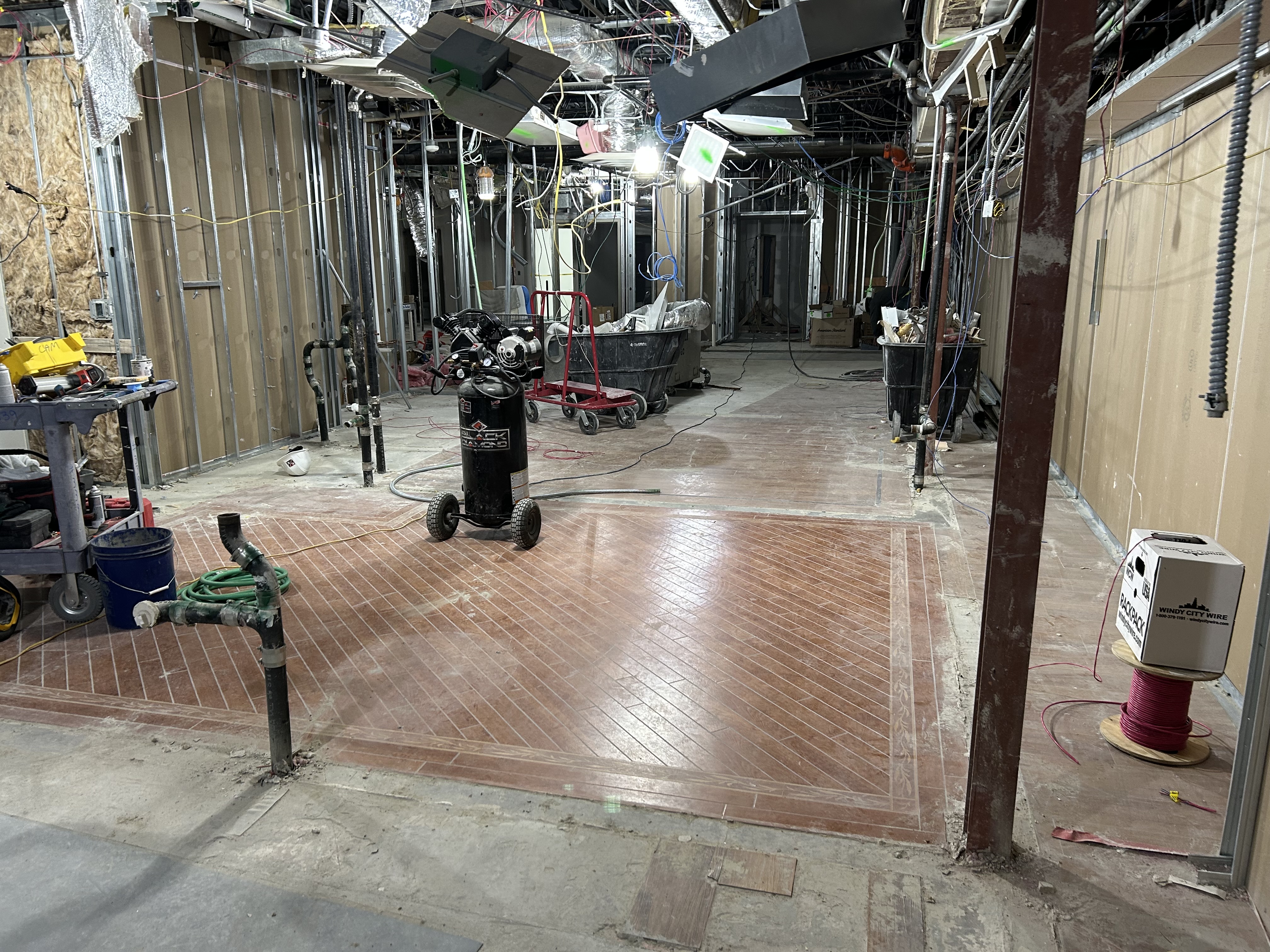 In the ceilings, light fixtures and sprinklers were set and ceiling grid went in.