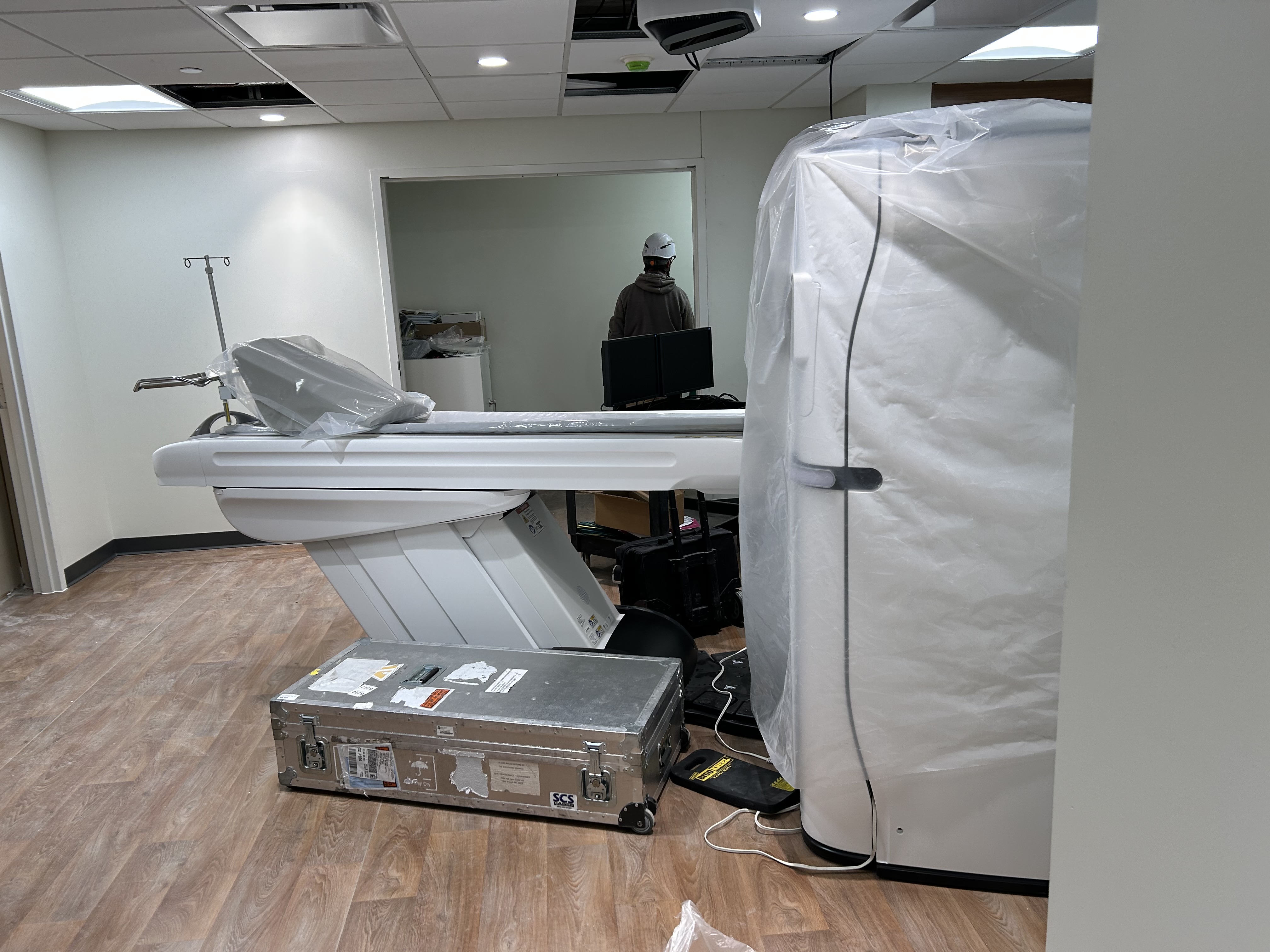 This is the nuclear medicine room. Equipment is pending installation. In the picture, you can see a large piece of paper on the ground. This is used to map out the location of the equipment so it can be placed properly once brought.