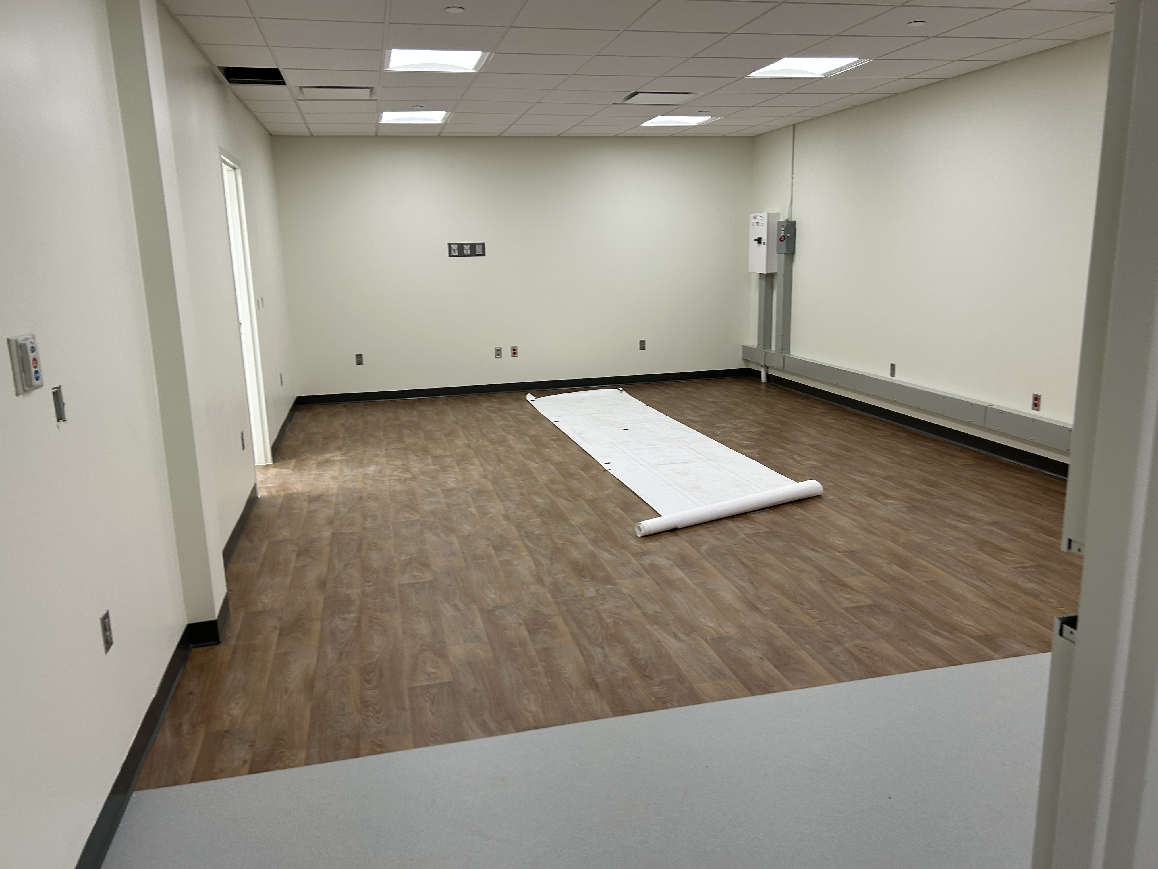 Also in the month of October, we started installing the flooring in our patient rooms. This flooring was heat welded in place to make sure nothing shifts or moves and connects the different types of flooring. The area with grey flooring is where the patient bed will be placed in the future. You can see on the ceiling, the black drape is covering the patient lift system, already installed in every room, that can be used to transfer patients without staff needing to strain their knees and backs.
