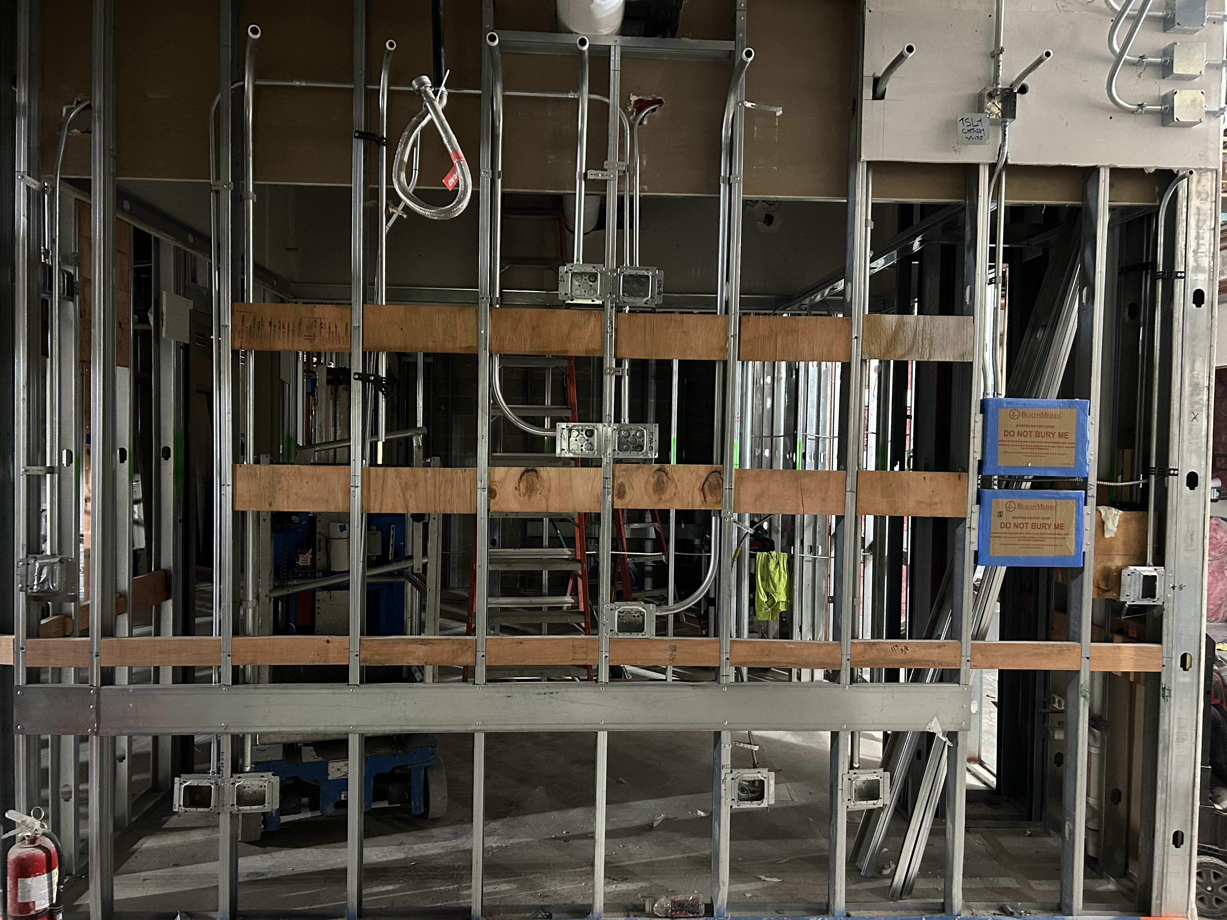 Here you can see blocking installed inside the walls prior to dry walling. This blocking is pivotal for future installation of countertops, telemetry system equipment, toilet and bath accessories including hand rails, towel dispensers and more.